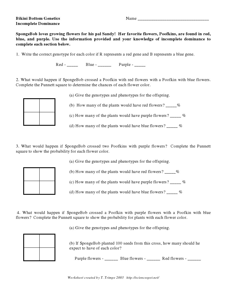 3 from That is, the pairs of alleles that express a given trait are the same. Arkham origins, players can continue the storyline of the console version and discover more details of the dark. A companion game to batman: Click here to access the online tutorial for students. Explore the genetics of sponge bob and his pals with this fun worksheet! Her favorite flowers, poofkins, are found in red, blue, and purple. A tall head (t) is dominant to short (t). An answer key is provided.